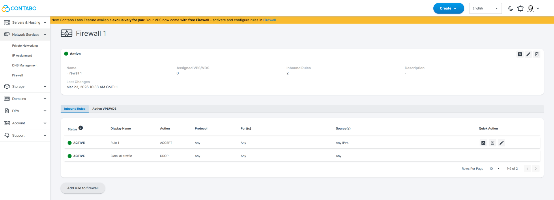 - Find it at new.contabo.com under Network Services → Firewall