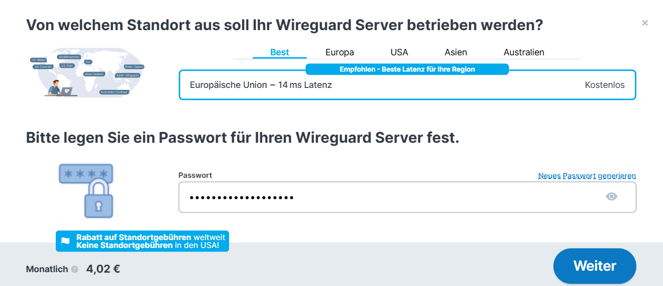 - Wähle deinen gewünschten Standort und lege ein Passwort fest (sowohl für VPS als auch Anwendung).