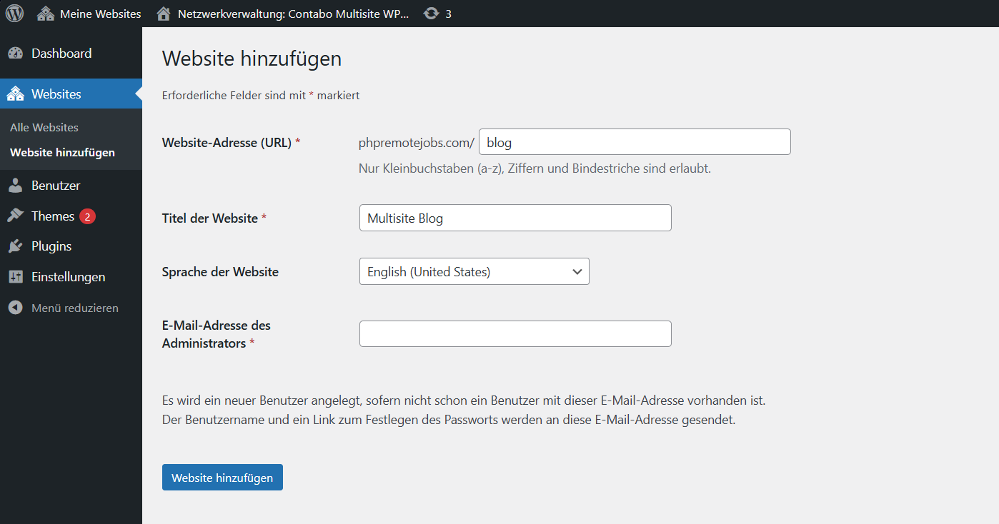 Gehe im Netzwerkadministrator zum Menü „Websites“. Gib die Seitenadresse (die Subdomain oder das Unterverzeichnis), den Seitentitel, die Seitensprache und die Administrator-E-Mail ein.