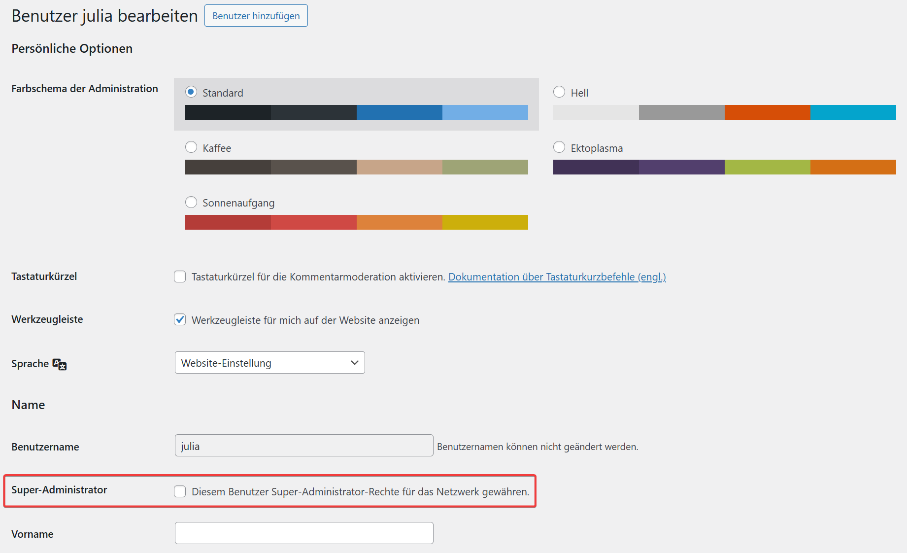 Um jemandem Super-Admin-Berechtigungen (vollständige Netzwerkkontrolle) zu gewähren, bearbeite sein Benutzerprofil und aktiviere das Kästchen Super-Admin. Verwende dies sparsam. Super-Admins können Plugins installieren, Seiten löschen und Netzwerkeinstellungen ändern. Beschränke diesen Zugriff auf Personen, denen du vollständig vertraust.