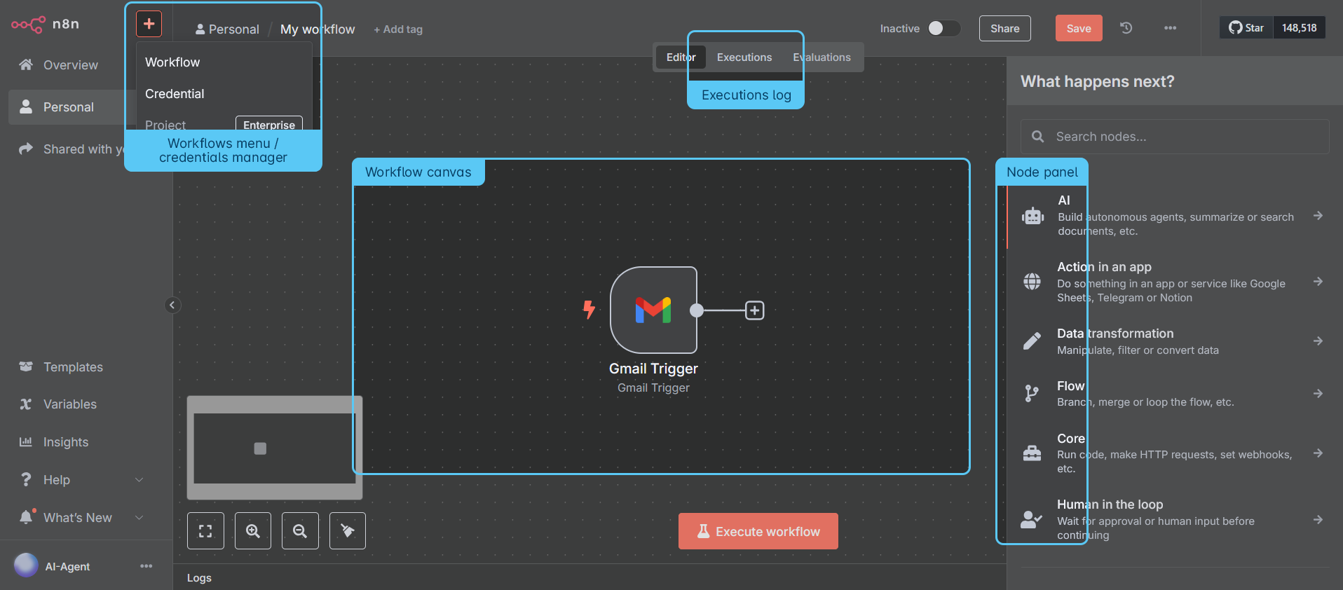 When you first open n8n, you’ll be greeted by a clean and intuitive interface. Taking a moment to get familiar with the three main areas you’ll be working in will save you a lot of time later on.