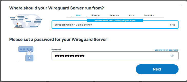 - Select your preferred location and set a password (used for both the VPS and the application).